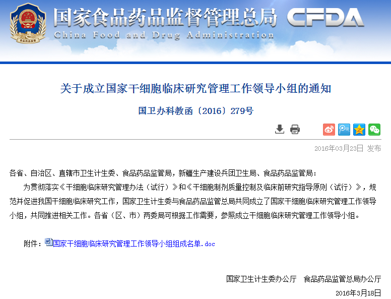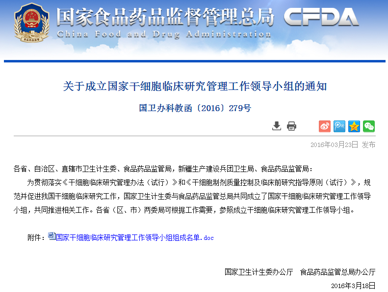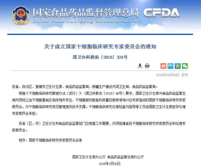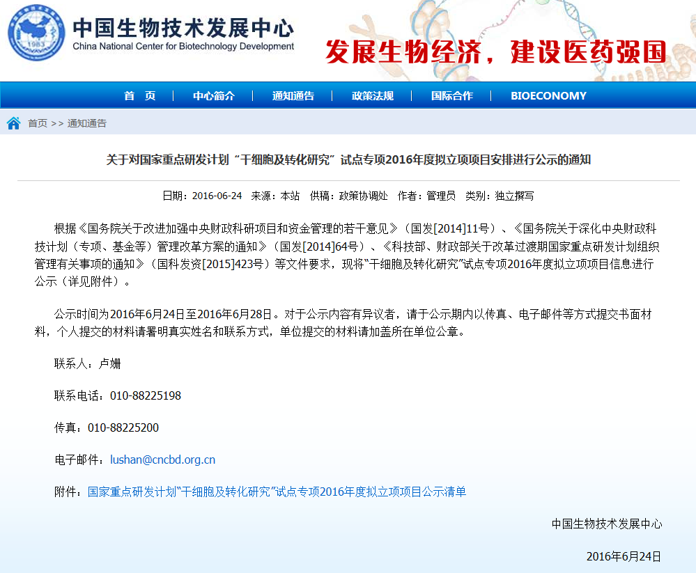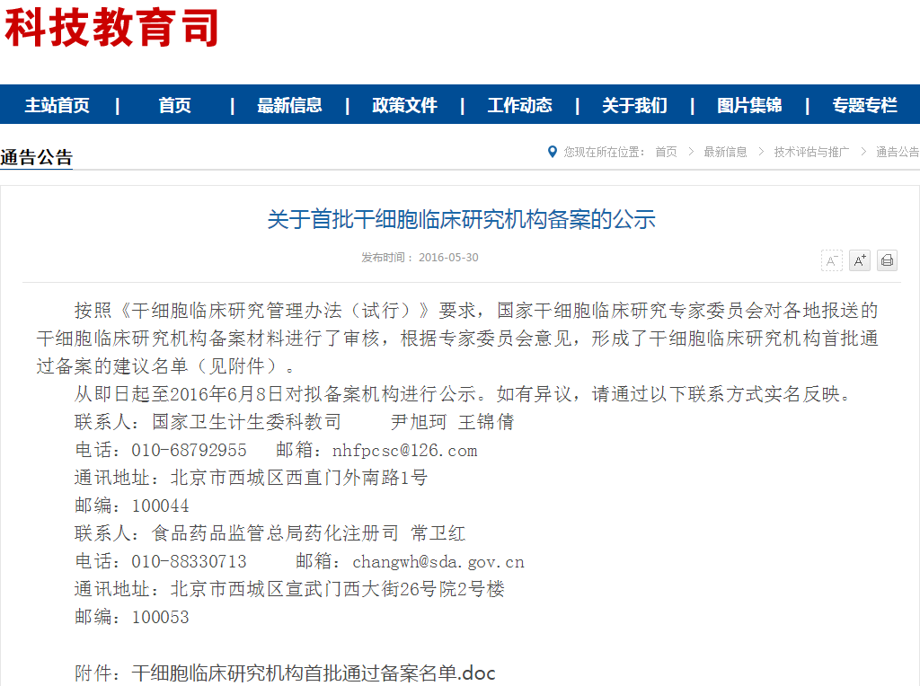 按照《干細(xì)胞臨床研究管理辦法(試行)》要求,國家干細(xì)胞臨床研究專家委員會對各地報送的干細(xì)胞臨床研究機(jī)構(gòu)備案材料進(jìn)行了審核,根據(jù)專家委員會意見,形成了干細(xì)胞臨床研究機(jī)構(gòu)首批通過備案的建議名單(見附件)。 從即日起至2016年6月8日對擬備案機(jī)構(gòu)進(jìn)…