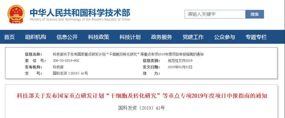 2019年1月21日,我國(guó)科技部官網(wǎng)正式發(fā)布了“干細(xì)胞及轉(zhuǎn)化研究”重點(diǎn)專項(xiàng)2019年度項(xiàng)目申報(bào)指南,指南中明確:在之前已支持98個(gè)項(xiàng)目的基礎(chǔ)上,2019年國(guó)家再撥款4億元,支持12個(gè)干細(xì)胞研究方向。其中干細(xì)胞資源庫(kù)、干細(xì)胞治療性腺衰老也寫(xiě)入申報(bào)指南。指南中明確…