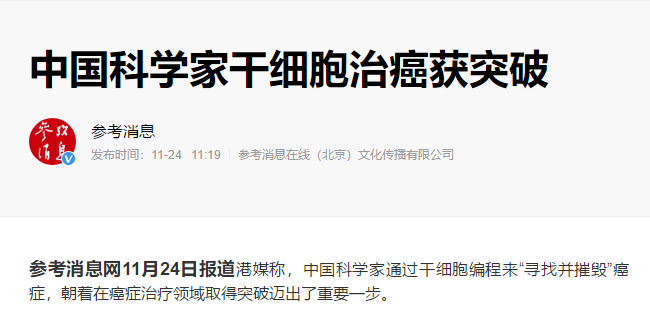 參考消息網(wǎng)11月24日?qǐng)?bào)道港媒稱(chēng),中國(guó)科學(xué)家通過(guò)干細(xì)胞編程來(lái)“尋找并摧毀”癌癥,朝著在癌癥治療領(lǐng)域取得突破邁出了重要一步。據(jù)…